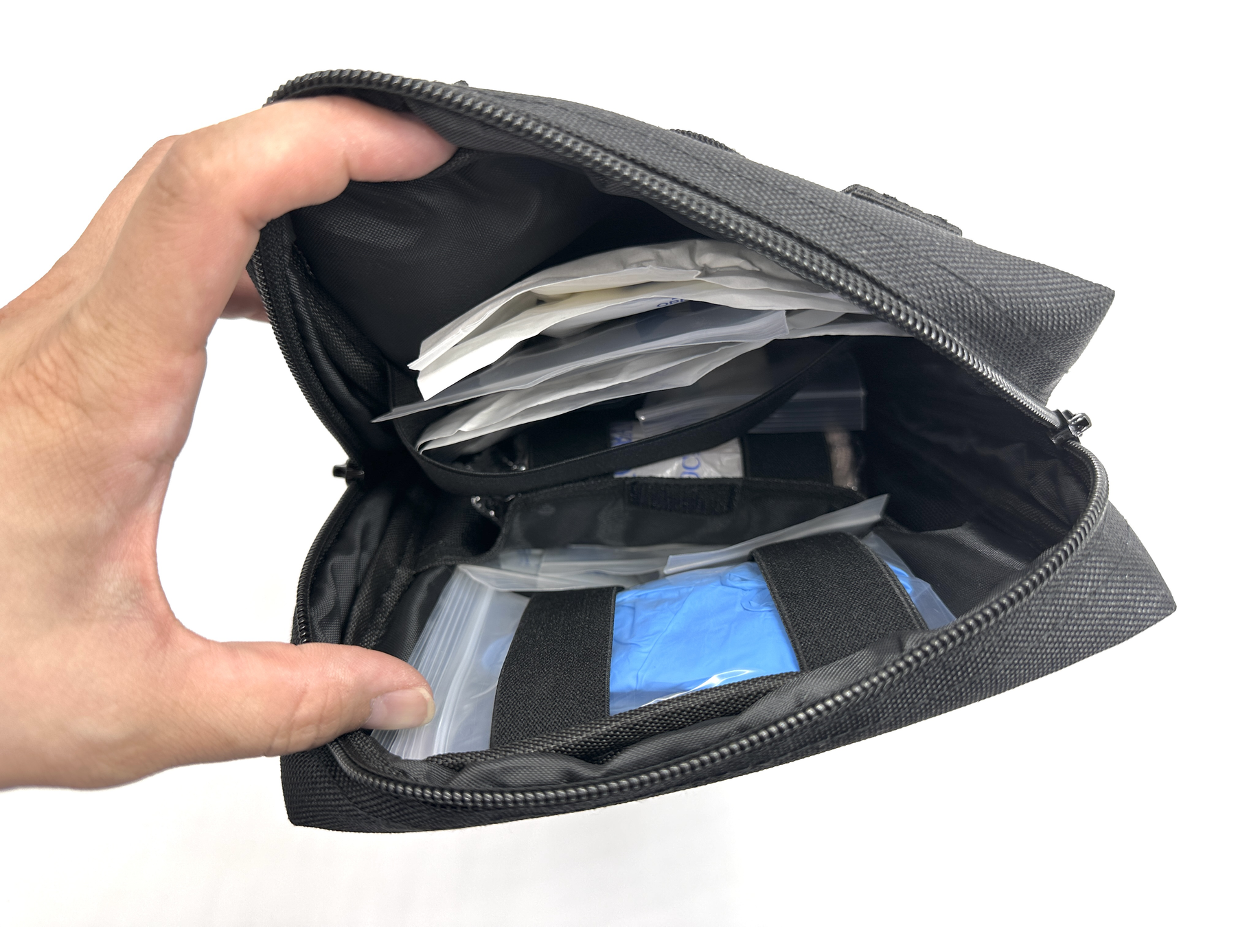 Elastic loops are in place to secure your gauze rolls, tape rolls, bandages, alcohol wipes, and other medical supplies. There’s still plenty of room left for IV Start Set, scissors and even sutures.