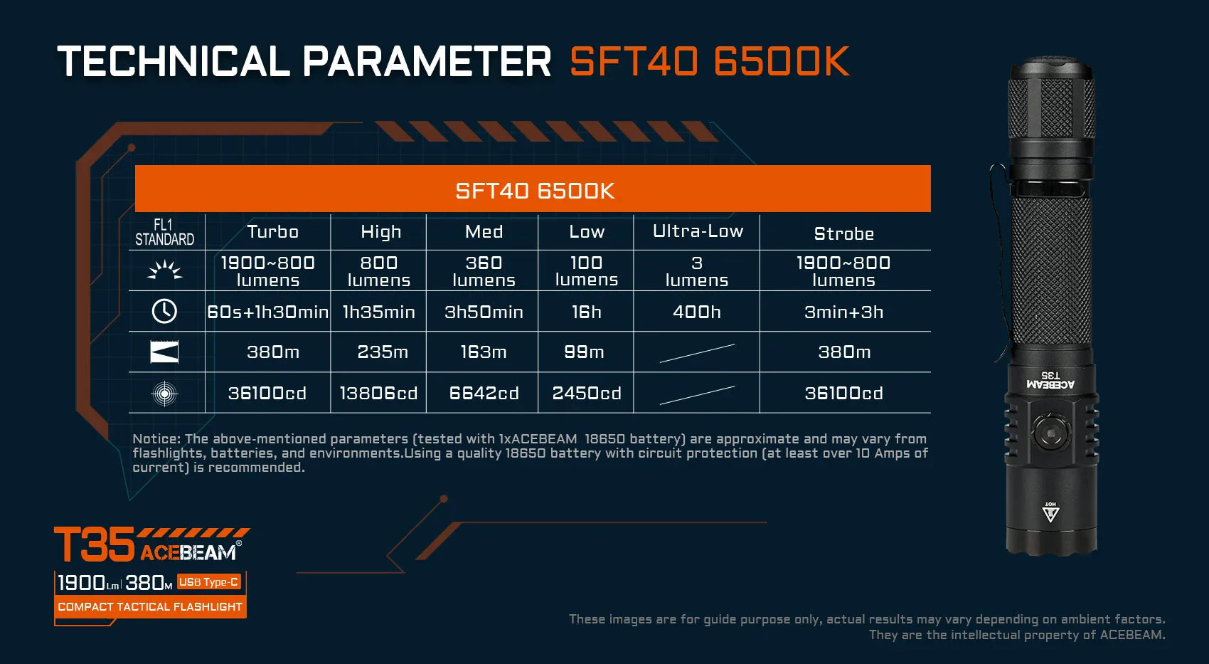 Discover the power and precision of the ACEBEAM T35, a sleek and compact rechargeable tactical flashlight designed for versatility and efficiency. Powered by a high-intensity SFT40 LED, this flashlight delivers an impressive maximum output of 1900 lumens and a beam reach of up to 380 meters. Its tactical ring feature transforms it into a multifunctional tool suitable for a variety of applications.
