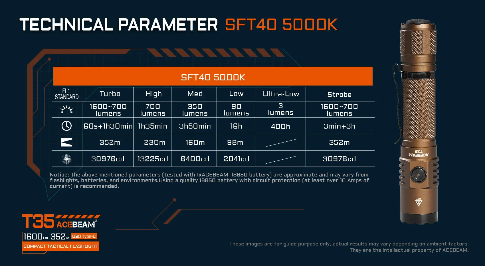 Every purchase includes one ACEBEAM 18650 2600mAh battery, and the flashlight is also compatible with 2 x CR123A non-rechargeable batteries. Equip yourself with the ACEBEAM T35 and light up your adventures with reliability and style.