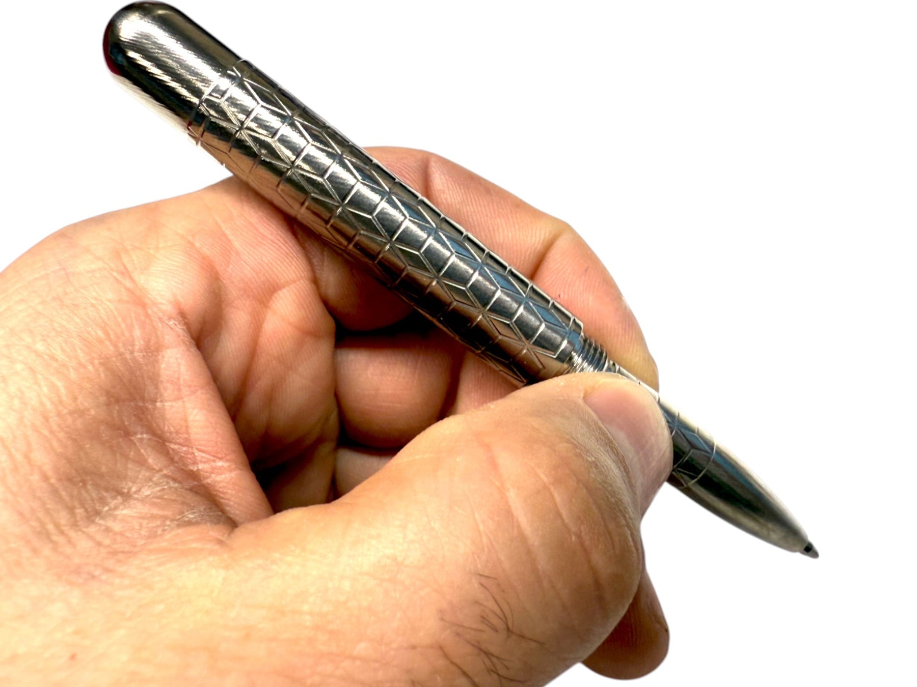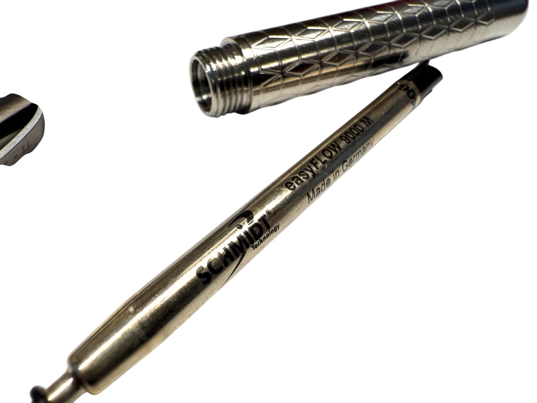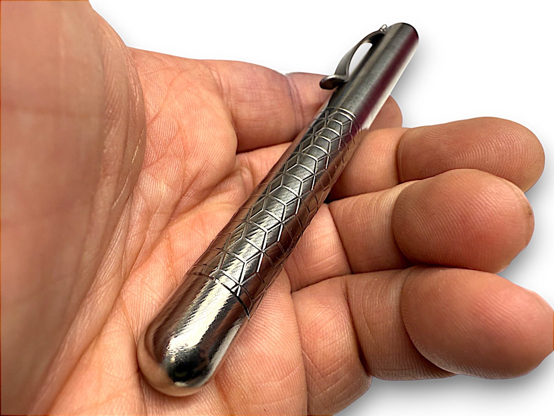 Welcome, all pen collectors and all-purpose pen users. We are fortunate enough to offer the new Titanium Embassy Pen after recently acquiring a small batch from a government contract. The pen is robust and made to last a lifetime; whether it's on the training field or in the office. A black medium pressurized Schmidt fill from -30F to +250F is included. The machined deep knurled grip is made for non-slip use. The built-in 301-grade stainless steel clip provides a secure fit in your pants or in your EDC bag.