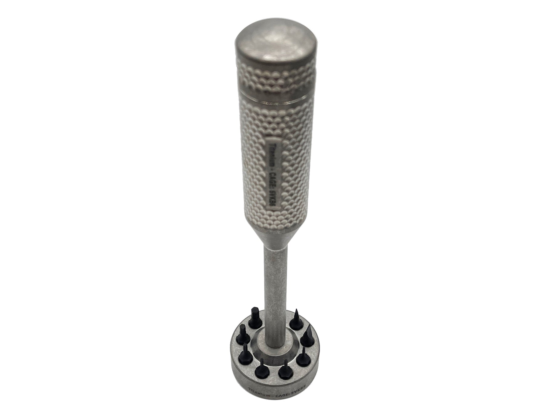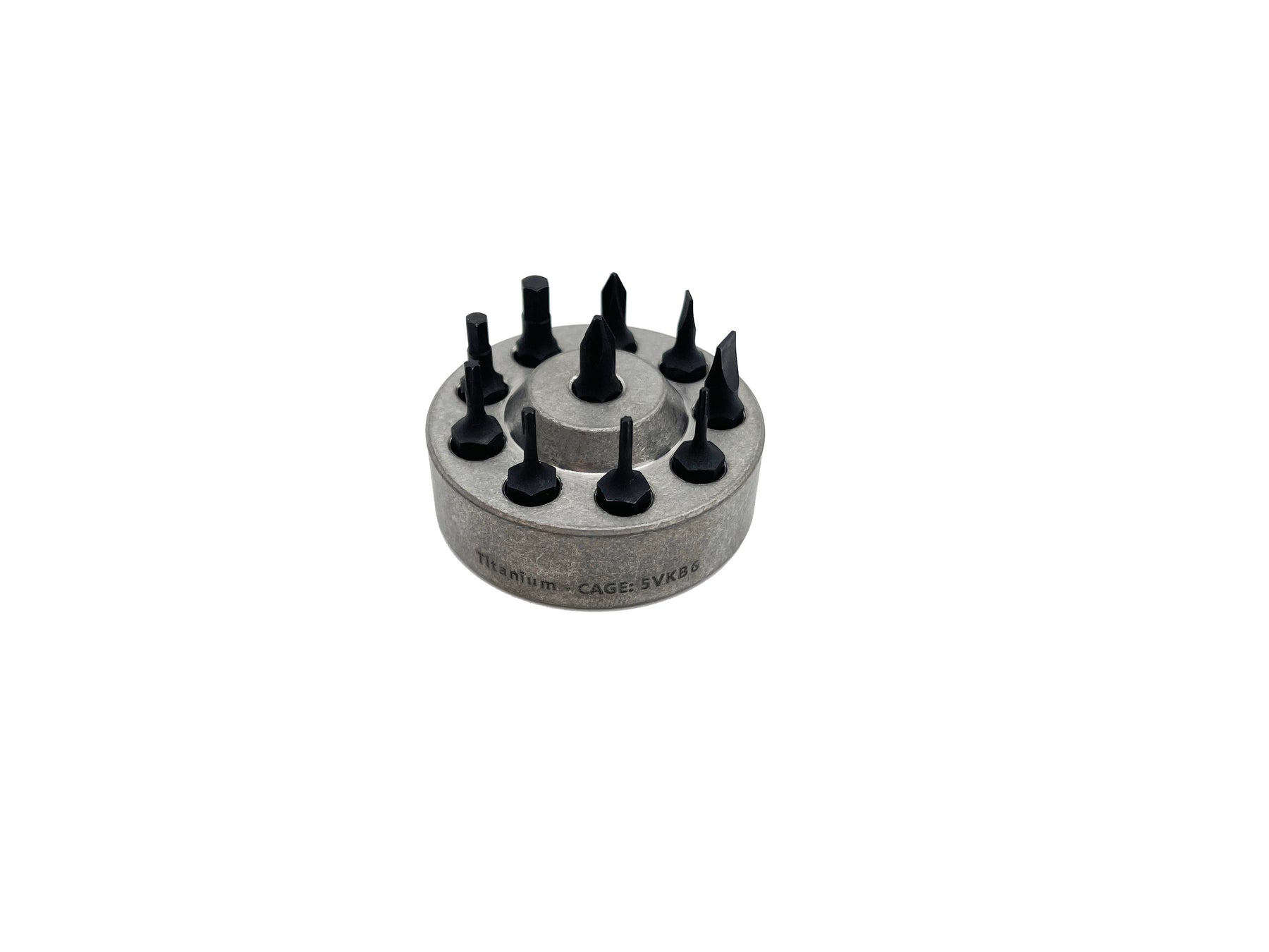 Universal Titanium Desk Stand fits all the versions of the TPSK , Aviation, 1/4" mechanics screwdrivers we have made in the past. Also will fit any 1/4" bit screwdriver, so this kit is truly multifunction and can be used with tools you already have. Also dont forget you can heat treat or electro anodize the desk stand to personalize it as well.
