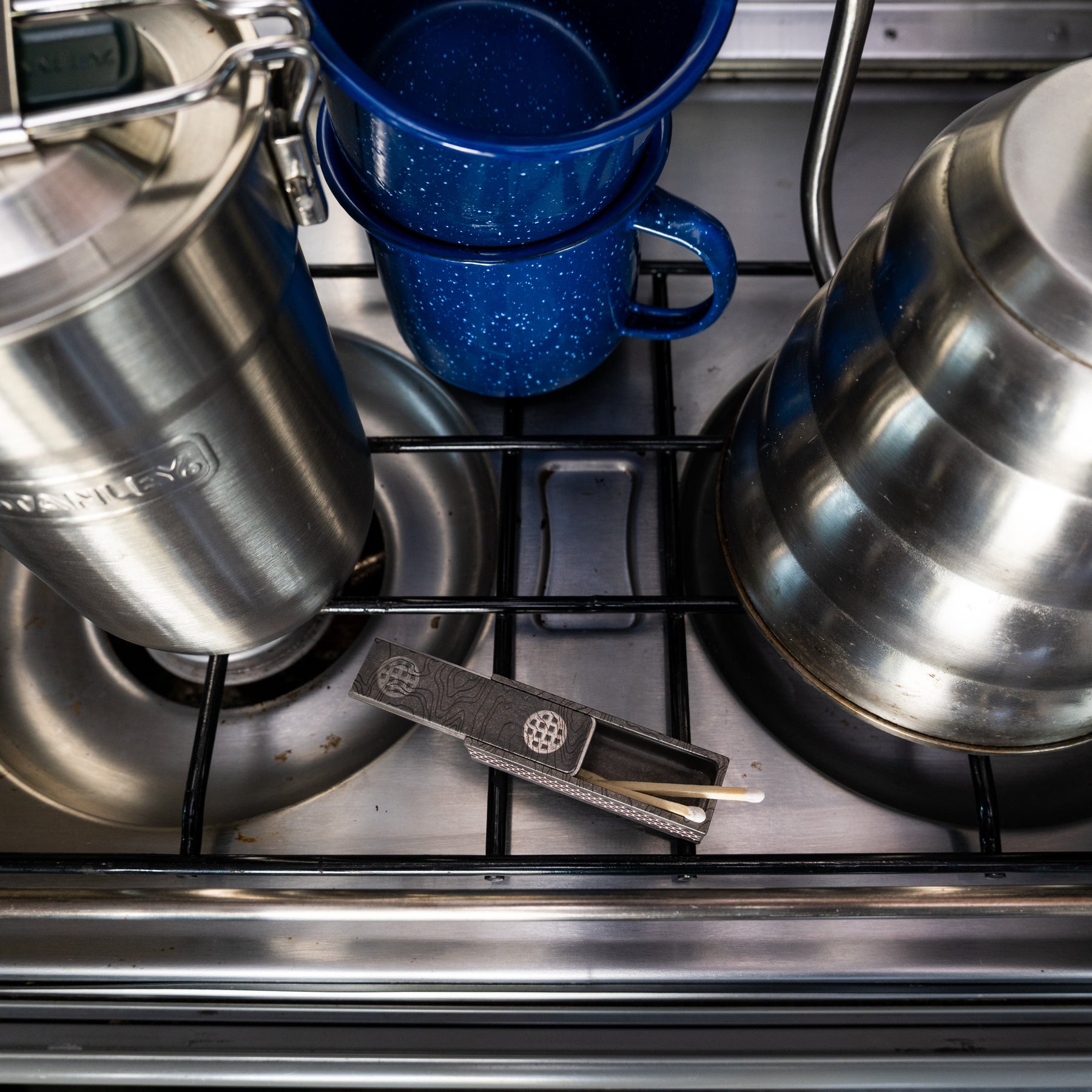 This incredible machined titanium Match Slide Box has a spring-loaded plunger securing the machined top. The top has been laser engraved with a topographical map pattern.