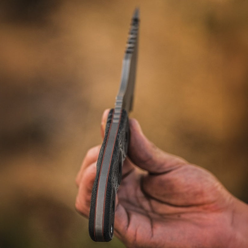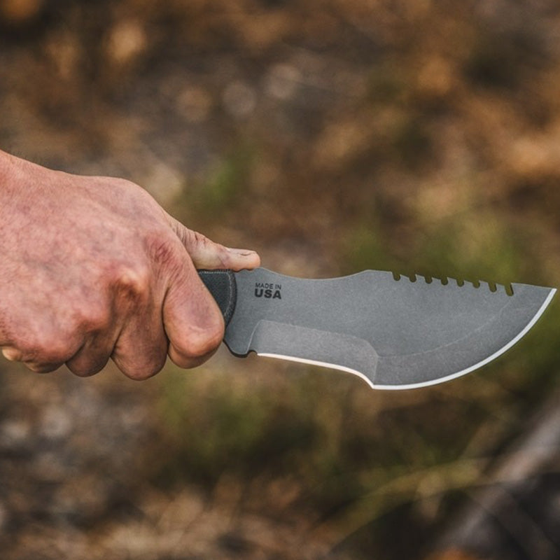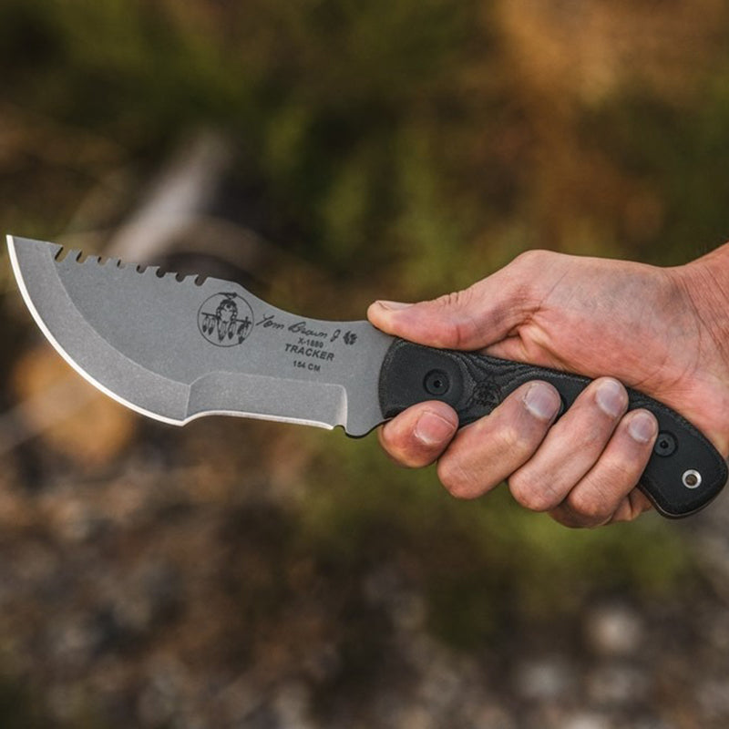 The Tom Brown Tracker has been one of the most popular blades produced by TOPS for many years. It is one of the biggest, beefiest multi-tools in existence. Designed by Tom Brown Jr. and featured in the movie "The Hunted". TOPS is proud to present the Tom Brown Tracker in 154cm stainless steel. The Tracker #3 is slightly larger than the Tracker #2 but slightly smaller than the Tracker #1. This design was made for chopping, skinning, carving, gutting, scoring, cutting, slashing, slicing, and just about anything else you would need to do in the wilderness.