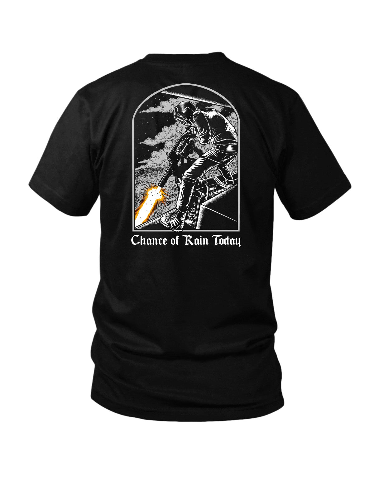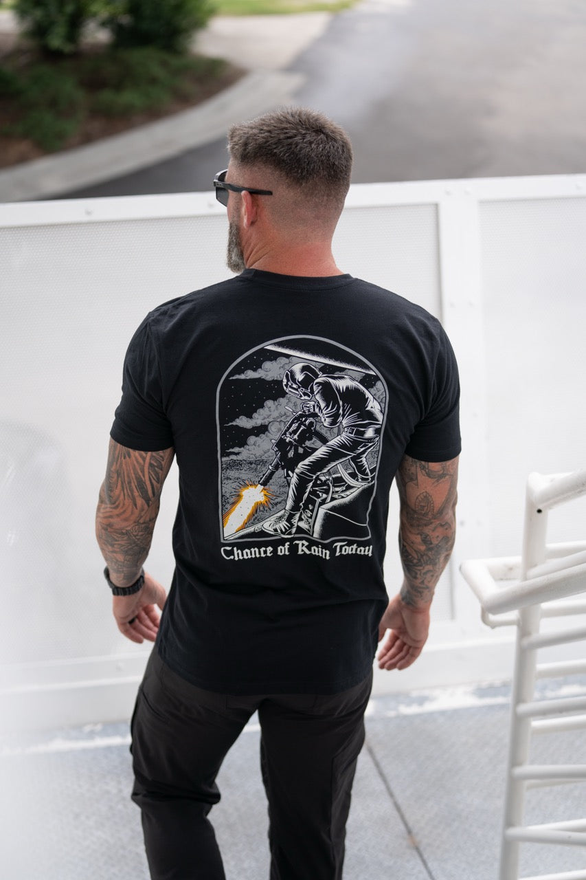 Chance of Rain premium black graphic tee rocks razor-sharp, top-tier silk screen prints on a soft, featherlight fabric. Built to keep its edge—fit, feel, and fierce design stay locked in wash after wash. This tee blends hardcore durability with next-level comfort for those who settle for nothing less.